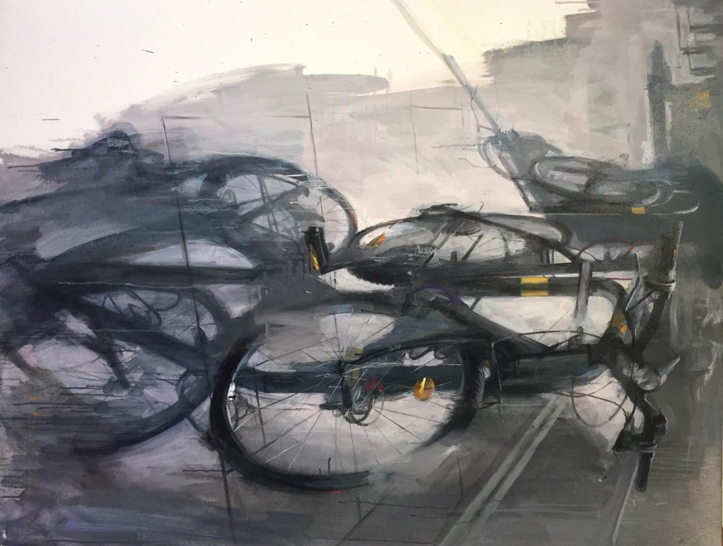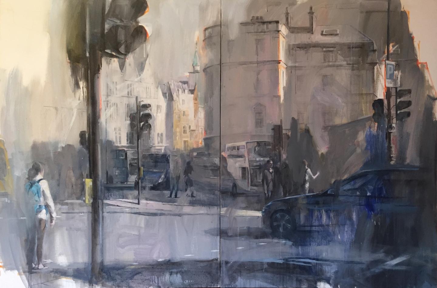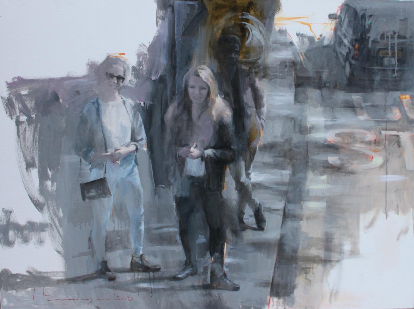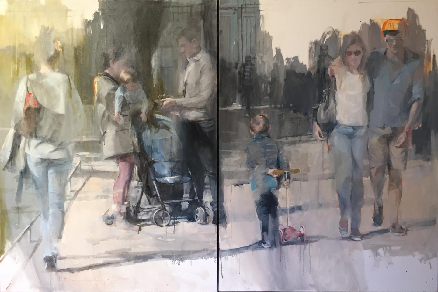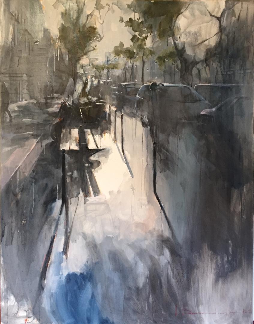Des scènes de l’espace urbain sont ici restituées avec la personnalité de cette artiste :famille et enfants, jeunes couples ou passagers en attente d’un bus, tous ces moments du quotidien auxquels nous n’attachons plus d’importance Adela Burdujanu les reconstitue dans l’intemporalité, l’anonymat. Ces « vibrations variées » comme elle nomme son travail lui permettent d’appréhender l’espace commun qu’est la ville, de se l’approprier et de le restituer par son art. Si le noir se révèle primordial dans la gamme colorée, elle l’éclaire de lumineuses transparences, de reflets sur l’eau sous l’effet de la lumière. L’artiste reconstitue la réalité sans la trahir ;elle en conserve l’esprit et ajoute sa part de réflexion, d’imaginaire aussi.