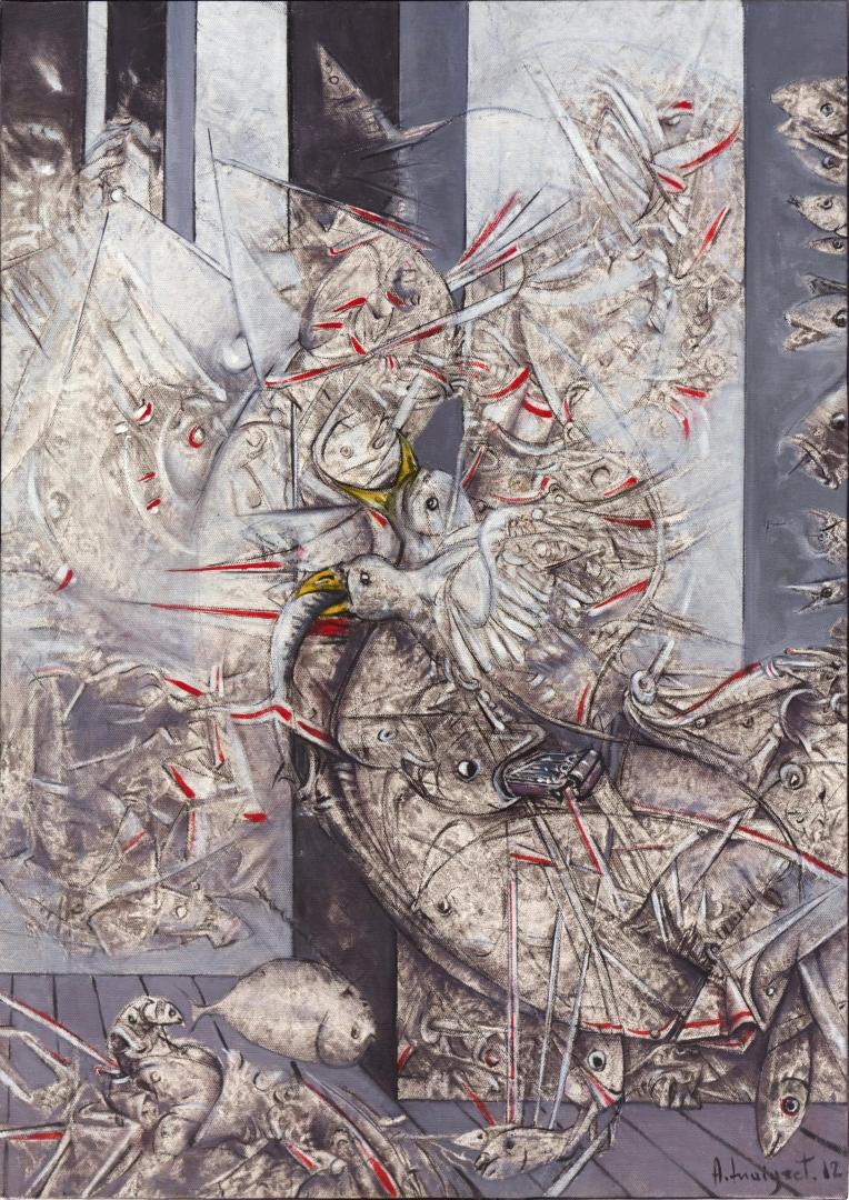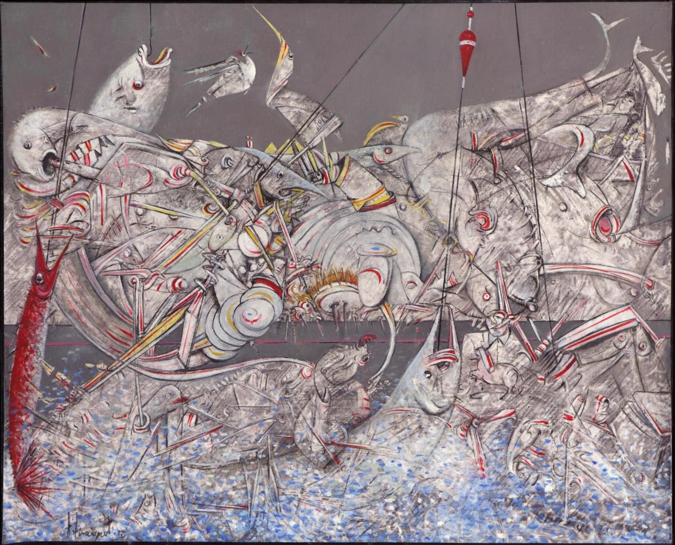 Baroques, ses toiles vivantes, dynamiques sont peuplées de poissons fantasmagoriques, réinventés qui semblent, dans certaines compositions, semer la terreur. Cet artiste déborde d’imagination, réalise des compositions où pullulent mille éléments et, ce qui fascine, ce sont ces visages au gré des thèmes le plus souvent aquatiques et, qui surgissent de ce fourmillement organisé.