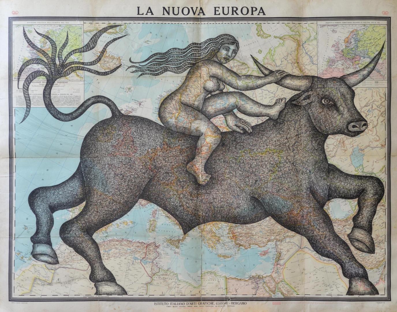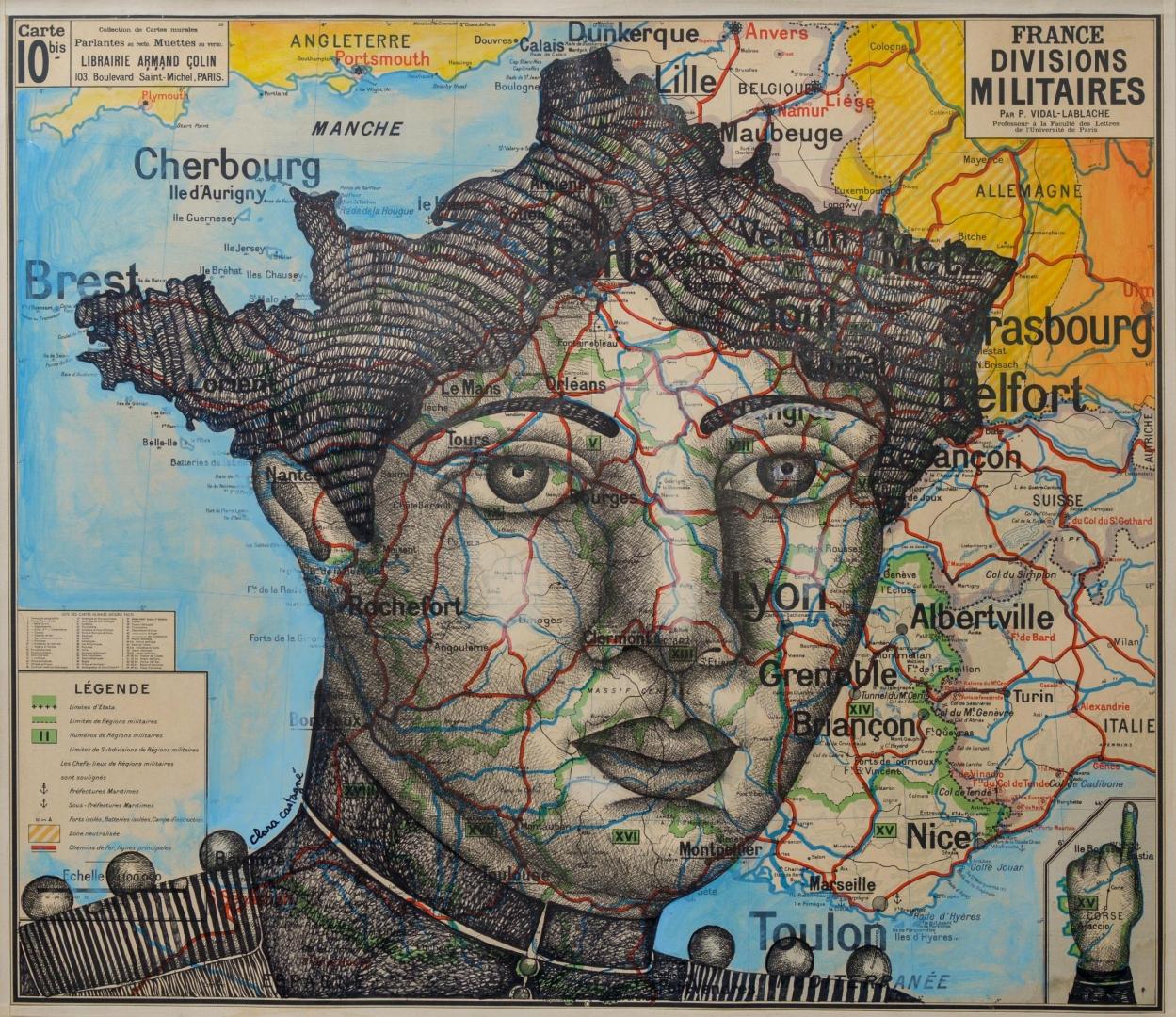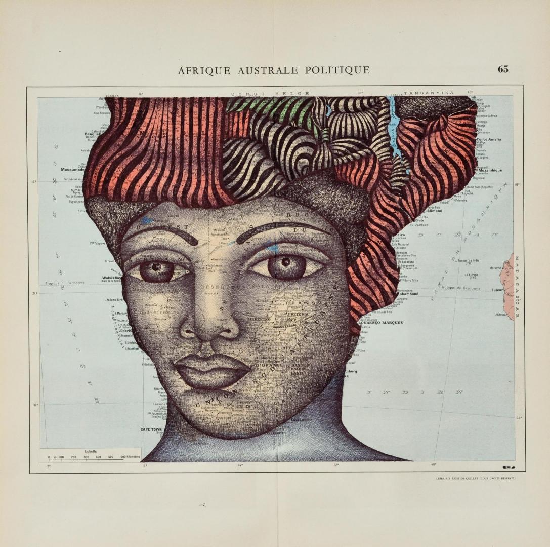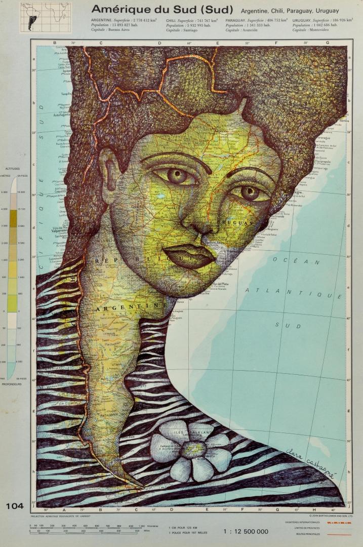 Si Clara Castagné prend pour thèmes l’anatomie, la mythologie, la géographie ou le portrait elle les détourne avec intelligence et invention. Lorsqu’elle aborde la géographie mondiale c’est à travers le portrait, le plus souvent féminin, ou en groupe. Très particuliers ces visages finement sillonnés de fleuves, de routes, de noms de ville et de régions à l’instar des cartes de géographie accrochées au mur des classes et dont le regard saisit par sa profondeur, son expression. Ils suscitent la curiosité. Chaque figure symbolise par ses traits le continent dont elle est issue. Ces portraits, comme en surimpression, portent la singularité de leur pays par un détail que Clara Castagné met en valeur par son écriture raffinée. Elle se libère des conventions en réalisant une figuration expressive ignorant le temps.