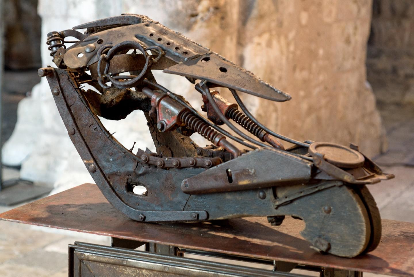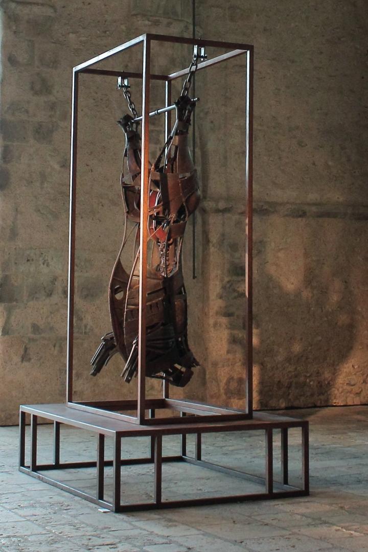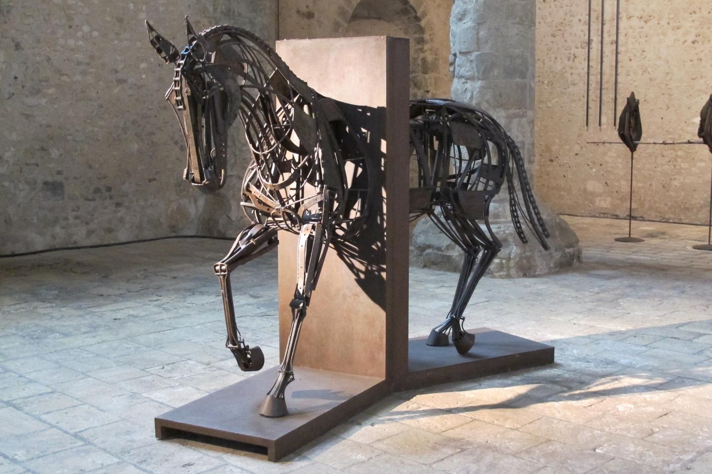 Par son travail savant et inventif, Christophe Dumont réalise un bestiaire singulier qui, sans trahir l’animal, lui offre comme une autre vie, une énergie, une vitalité rares. Ce sculpteur a tout d’abord été décorateur jusqu’en 1995, année où il a décidé de se consacrer à son art. Dans une construction originale des formes réalisées à l’aide de baguettes ciselées ou différemment travaillées associées à des plaques de métal, il laisse des vides générateurs de légèreté. Cet artiste confère le frémissement de la vie aux animaux, des chevaux pour la plupart dont il évoque la structure interne, la musculature ; le rythme des lignes crée la vie. On est ici entre l’observation du réel et l’imagination. Dans son art figuratif, le besoin d’expression prédomine, même si Christophe Dumont demeure plutôt fidèle à la réalité. Une sorte d’expressionnisme apparaît dans le dynamisme des volumes et sa connaissance du métal fait merveille ; ses œuvres s’inscrivent parfaitement dans l’espace. Une sculpture retient particulièrement l’attention, « Bœuf écorché » inspirée de Rembrandt ; suspendue, la carcasse tracée par le maître hollandais en larges touches de peinture sont remplacées par des plaques de métal. Toute la beauté tragique, cruelle apparaît. Bien différent « Le Crâne équin », exécuté à partir d’objets de récupération, est saisissant de vérité.