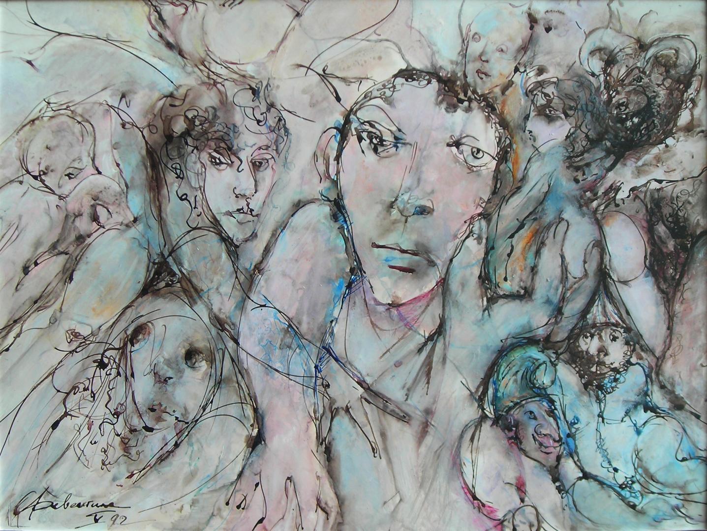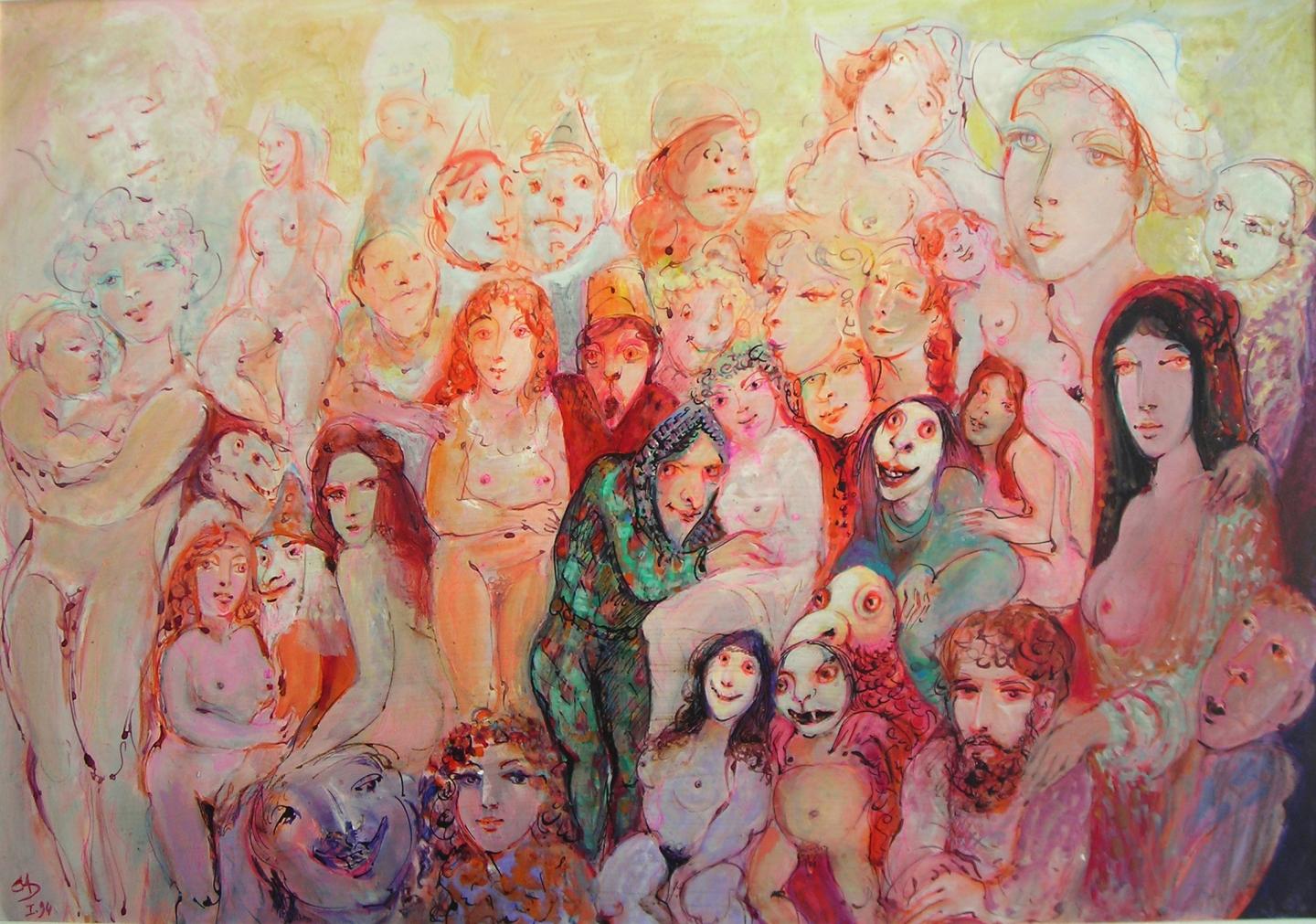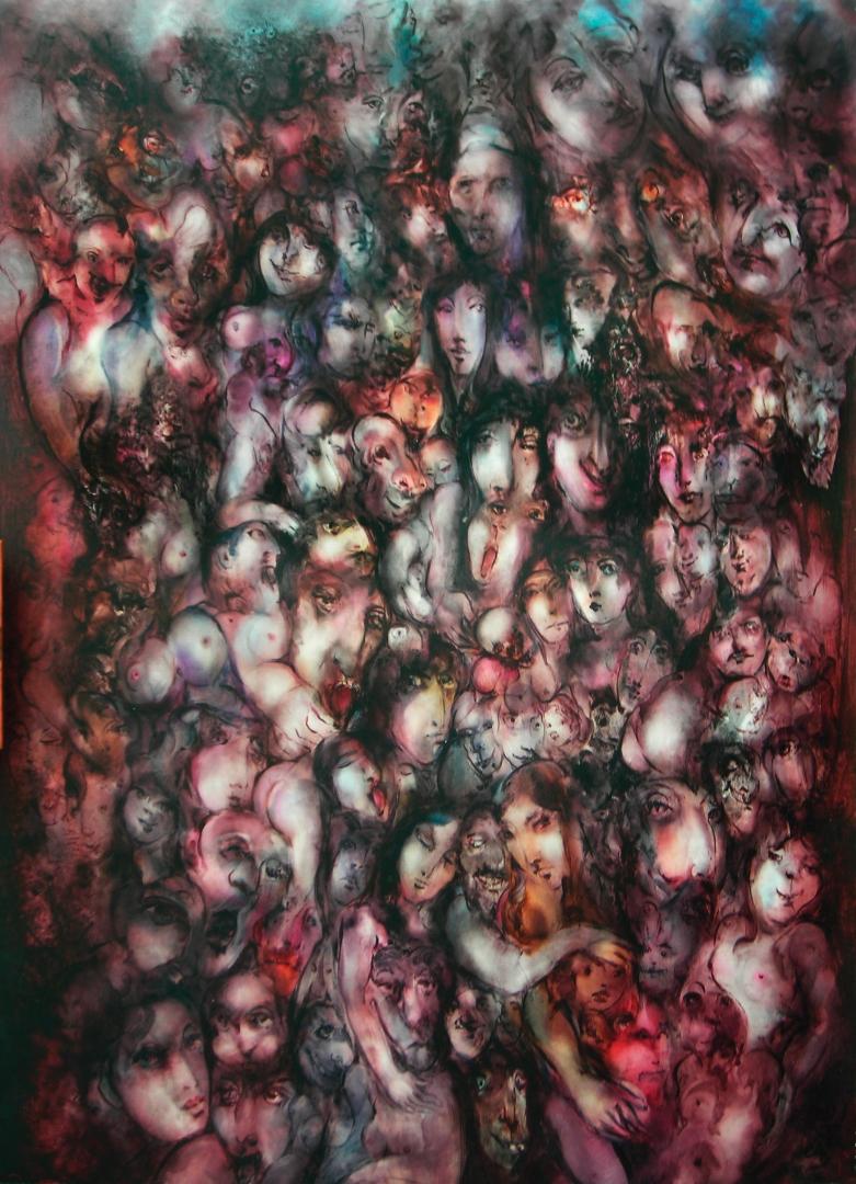 En une touche emportée il campe des personnages féminins pour la plupart, le plus souvent en groupe, aux volumes opulents, aguichants. Certaines se présentent dans leur nudité sans gêne parmi les autres. Une peinture dans laquelle le dessin est en majorité créé par la couleur mis à part les visages. On assiste à une danse des corps qui s’offrent sans pudeur délicatement exécutés en contraste avec la force de la palette et parmi ces jeunes femmes des visages masculins.