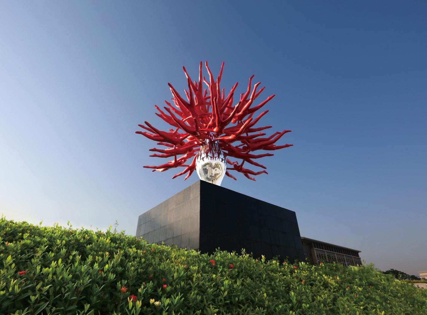 Sa création est une synthèse de la modernité et des fondamentaux de l’art ancestral. Soucieux du contexte, son œuvre est à contre-courant du monumental kitsch international. Avec de nouveaux matériaux, de nouveaux formats imposés par l’architecture urbaine, il y réinsuffle le goût chinois pour le mouvement perpétuel, la fluidité métamorphique des quatre éléments. C’est un maître de l’espace. Son œuvre oscille entre des polarités fortes : abstraction très stylisée, calligraphique et figuration virtuose. On reconnaît dans ses monuments l’esprit de Canton, ville d’entrepreneurs et de commerçants, ville maritime et ouverte aux influences d’Orient et d’Occident. Sa “signature” est “l’élan vital".