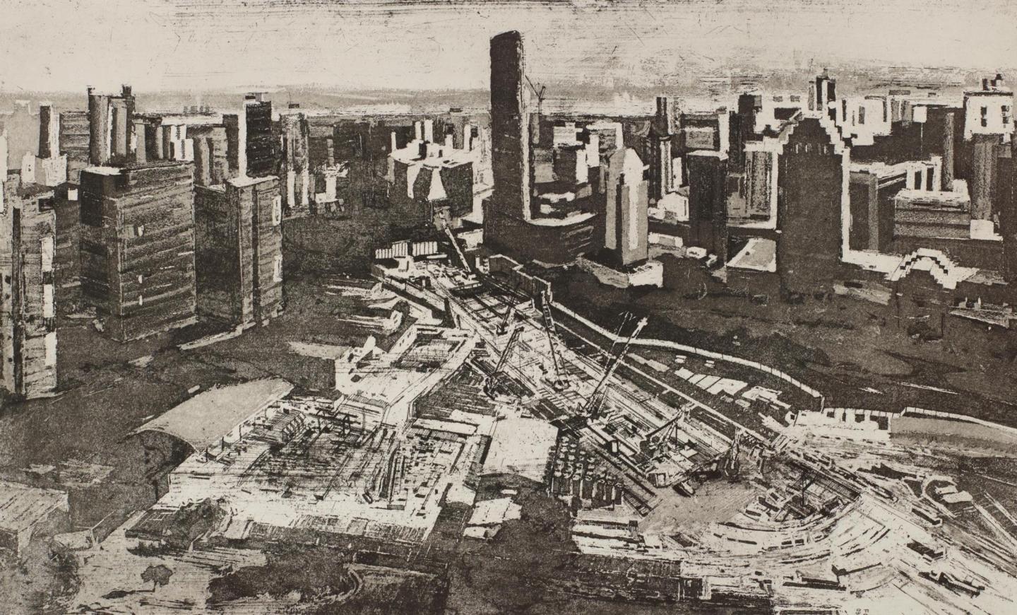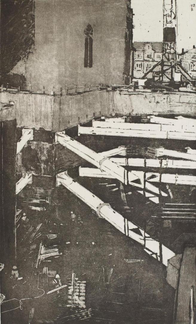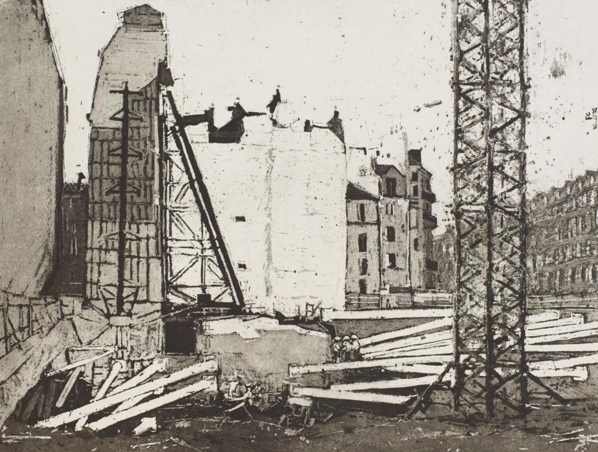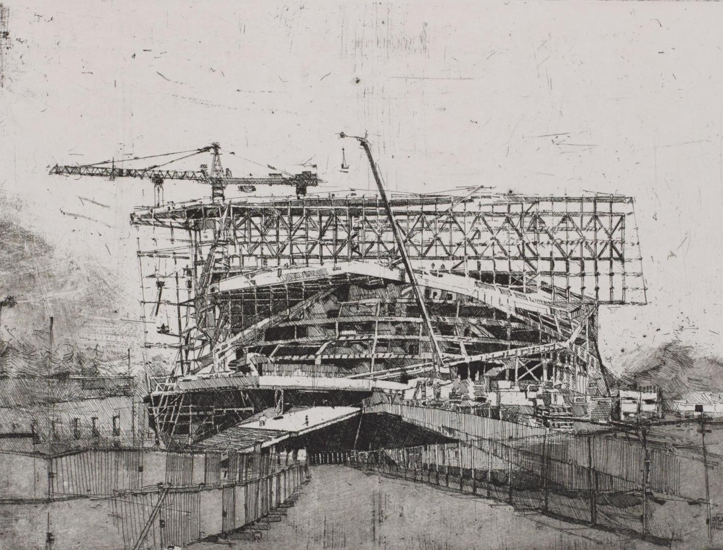 Valoriser les chantiers et les transformations urbaines par le dessin et la gravure est l’orientation du projet baptisé Par la ville et les chantiers… Suivre sur la durée la naissance d’un bâtiment au cœur de la ville, se mêler aux constructeurs, raconter leur quotidien ou l’arrivée d’une pièce… tels sont les motifs du travail qui débute sous forme de dessins sur site, avec différentes techniques (pierre noire, encre, aquarelle…) et aboutit en atelier par la composition de gravures sur cuivre.