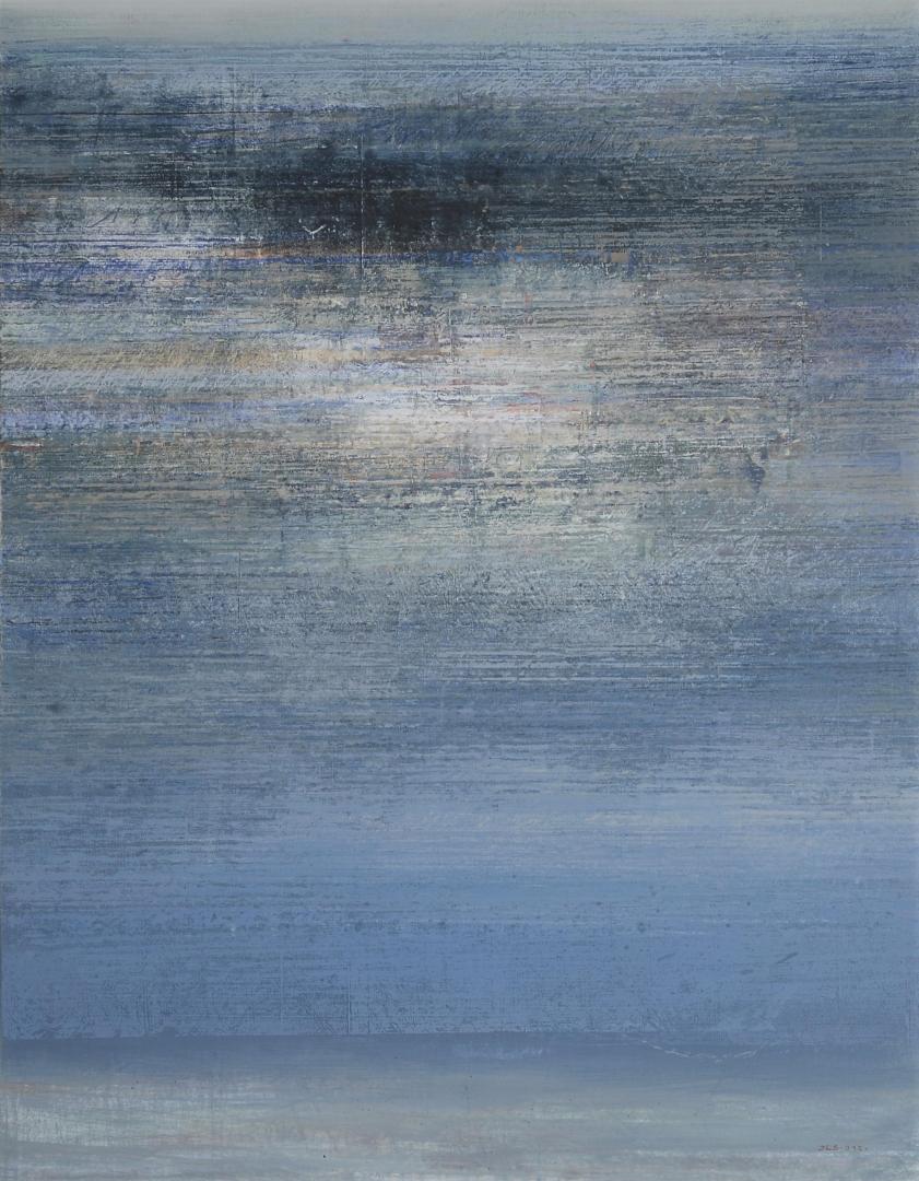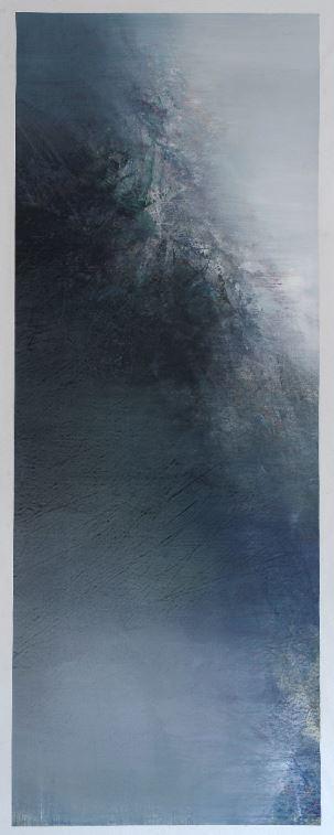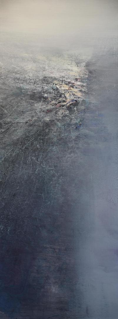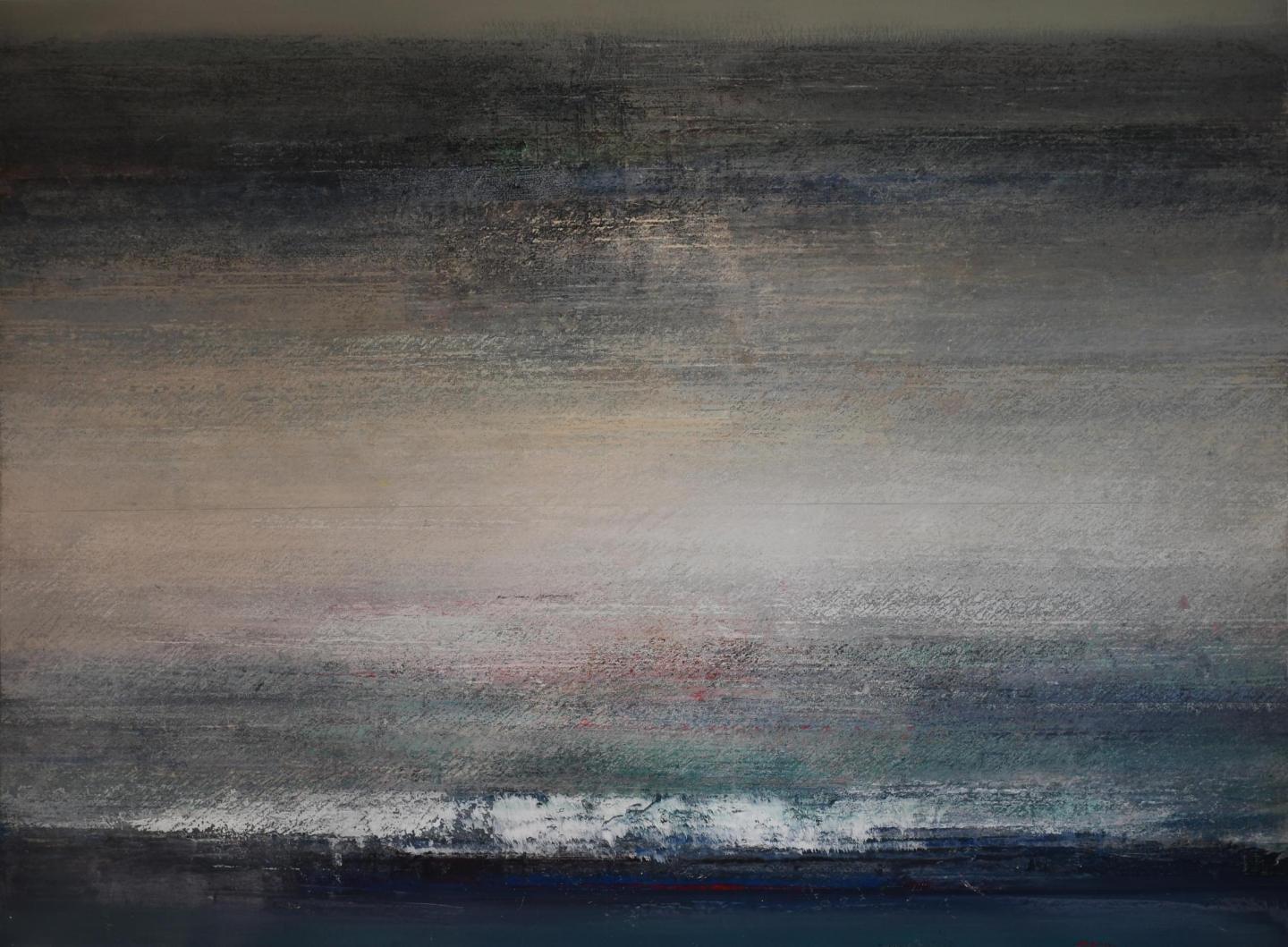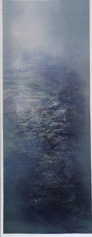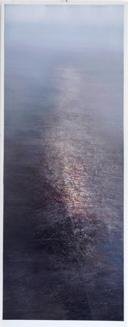 Jean-Luc Bourel travaille ses toiles avec des couleurs minérales et des tons neutres qui évoquent des eaux