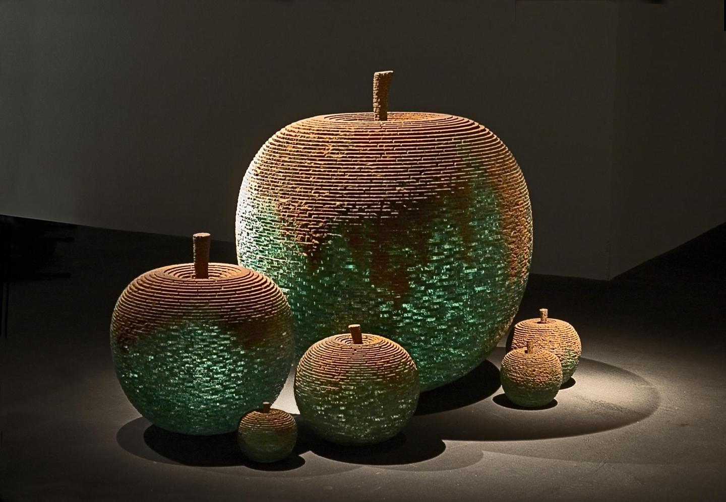 des pommes de toutes tailles et de tous matériaux. L’humanité est à la source de son inspiration, une