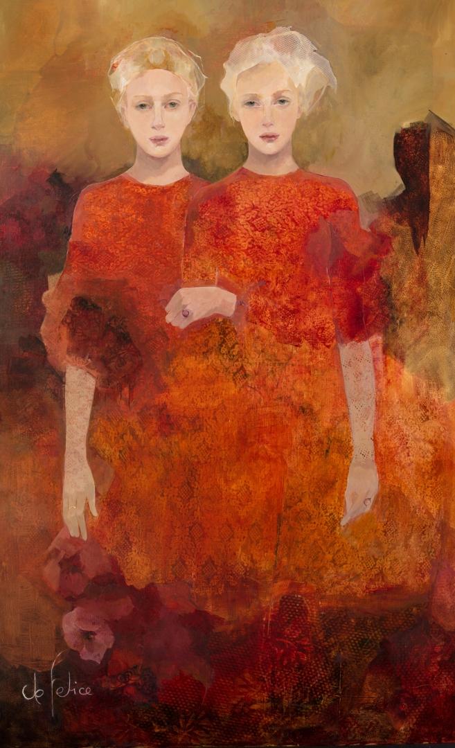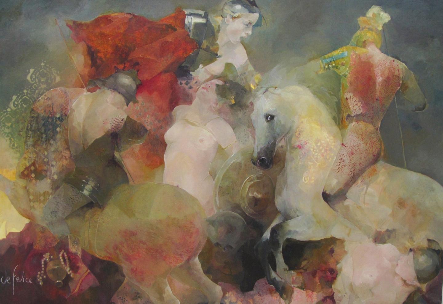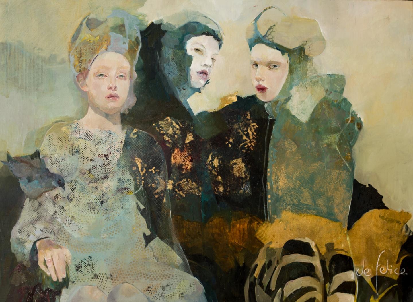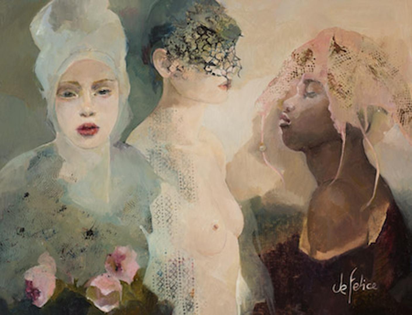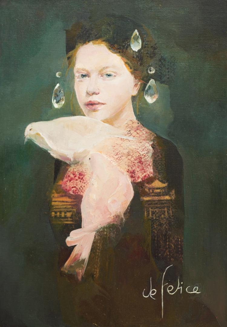 Il y a loin de l’impressionnisme pratiqué au début de sa carrière à ces jeunes femmes un peu énigmatiques. Françoise de Felice s’est peu à peu trouvée à l’étroit dans l’appartenance à ce mouvement ; elle a cherché et a trouvé un style qui lui permettait de s’exprimer avec liberté et dans l’originalité. Elle s’exprime en une pâte travaillée et légère qui parfois permet des flous et qu’elle agrémente d’empreintes ici et là. Les visages au teint clair et lumineux, au regard personnel possèdent une sorte de magie envoûtante ; les jeunes femmes apparaissent présentes avec cependant une certaine retenue ; il s’en dégage une vraie douceur. On songe aux fêtes vénitiennes, aux élégantes de ces siècles passés dans leurs robes sophistiquées ; certaines sont accompagnées de colombes. Ainsi est créé un univers de paix et de beauté.
