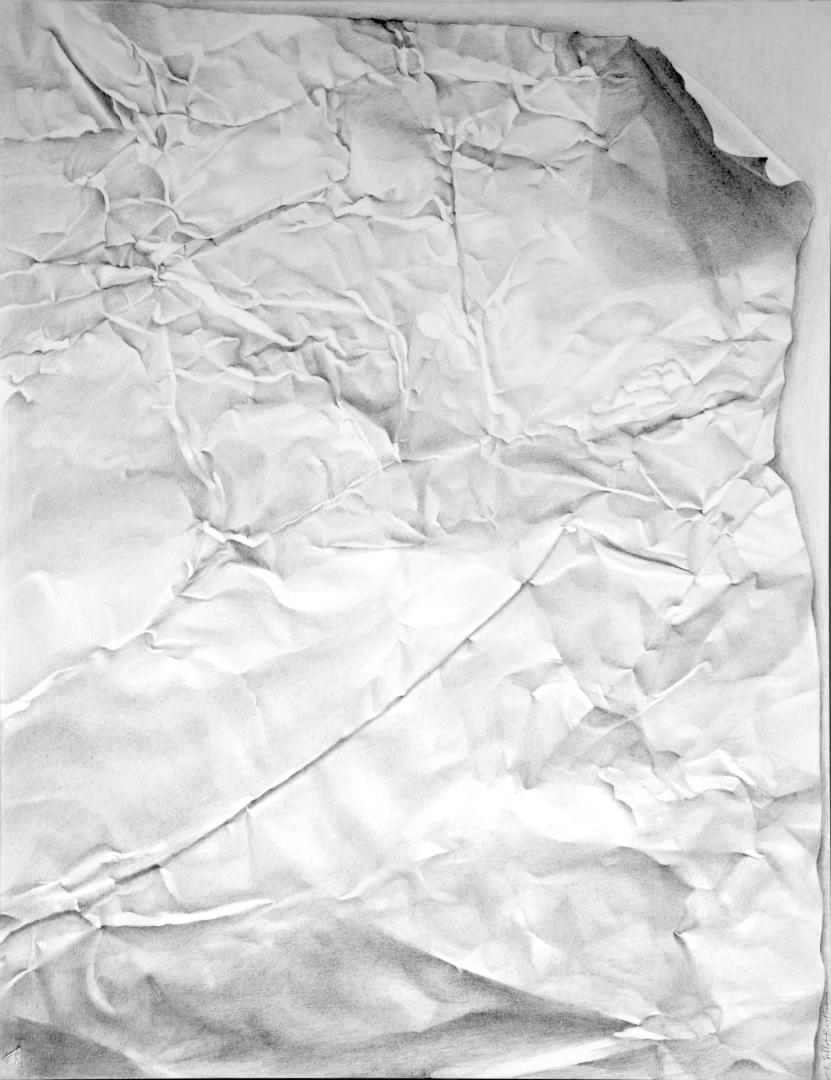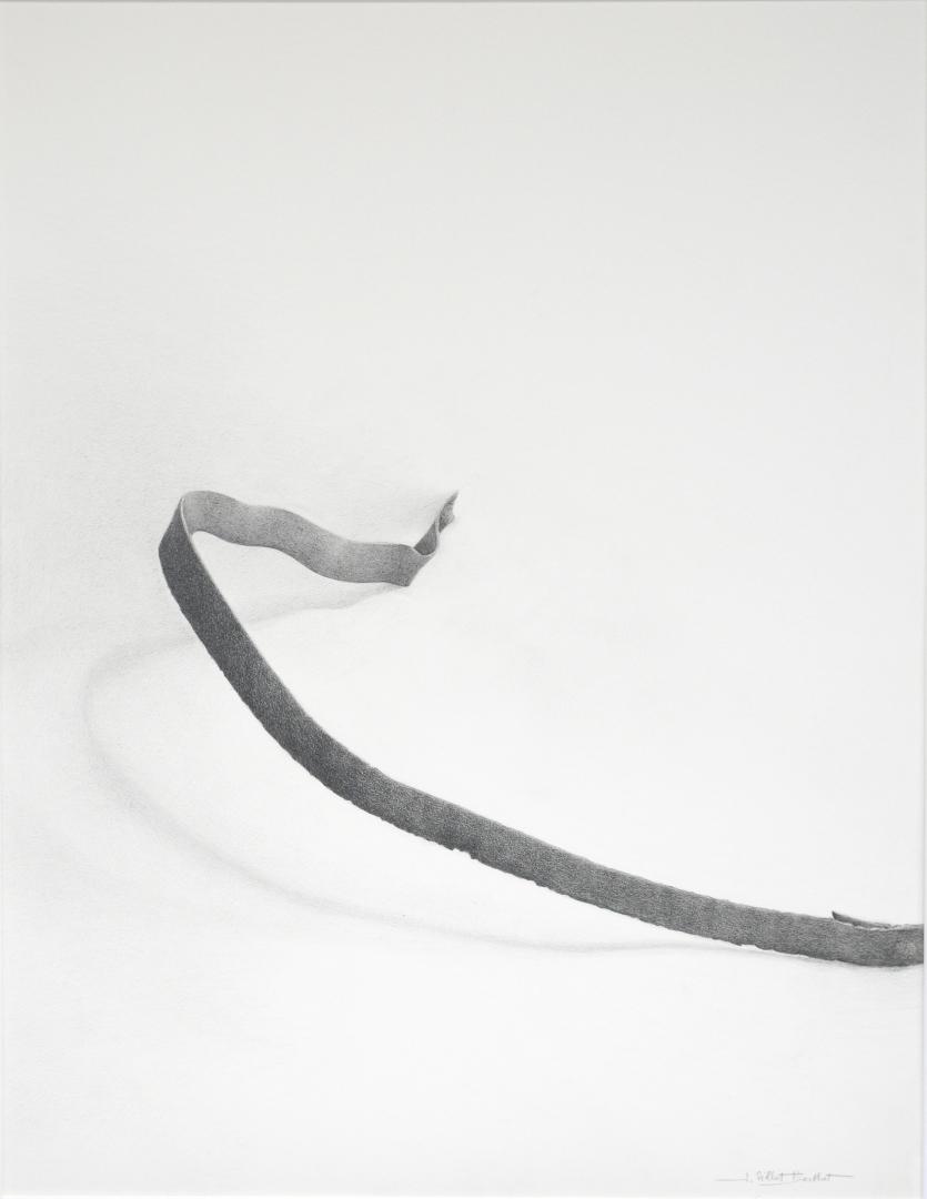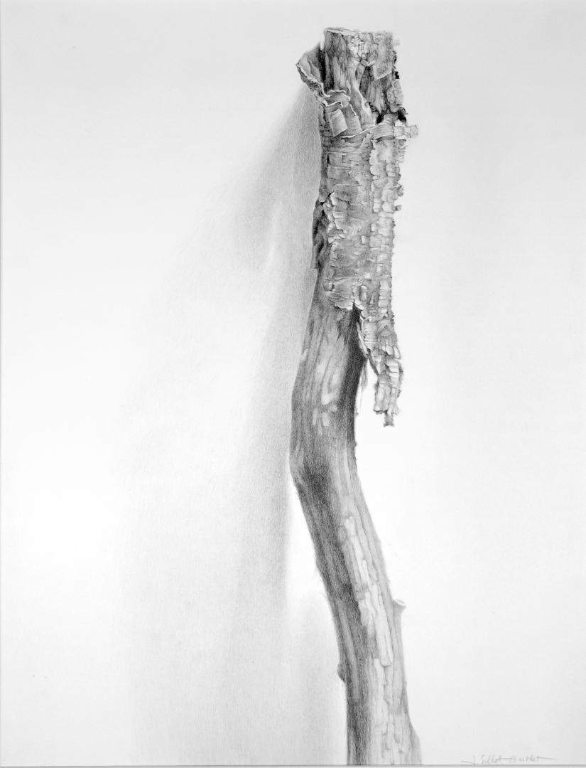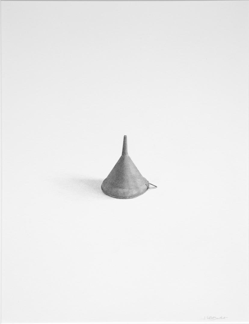 Entonnoir, barre de fer, bout de bois, autant d’objets sans importance que la dessinatrice par son talent, sa sensibilité, élève au rang d’œuvre d’art. En un dessin rigoureux, de subtils contrastes, de fort délicates ombres portées, elle recrée le quotidien, ces petites « choses » que nous ne voyons plus. Ces objets figurent, seuls, au centre d’un espace blanc qui attire le regard sur leur présence et les délicates vibrations des noirs et des multiples gris. Ces feuilles donnent l’illusion de la facilité, il n’en est rien ; il s’agit d’un travail conçu, minutieux. L’artiste adapte son écriture au sujet choisi : le fil de fer se déroule sinueux et léger dans l’espace alors que la barre de fer impose sa force. Lorsqu’elle évoque un tronc d’arbre, le crayon dessine chaque détail de l’écorce, du bois. Ces objets ont leur histoire mais ces dessins emportent plus loin, témoins de l’exigence plastique de la dessinatrice autant que de son désir d’aller au-delà de cette réalité banale avec une intéressante économie de moyens.