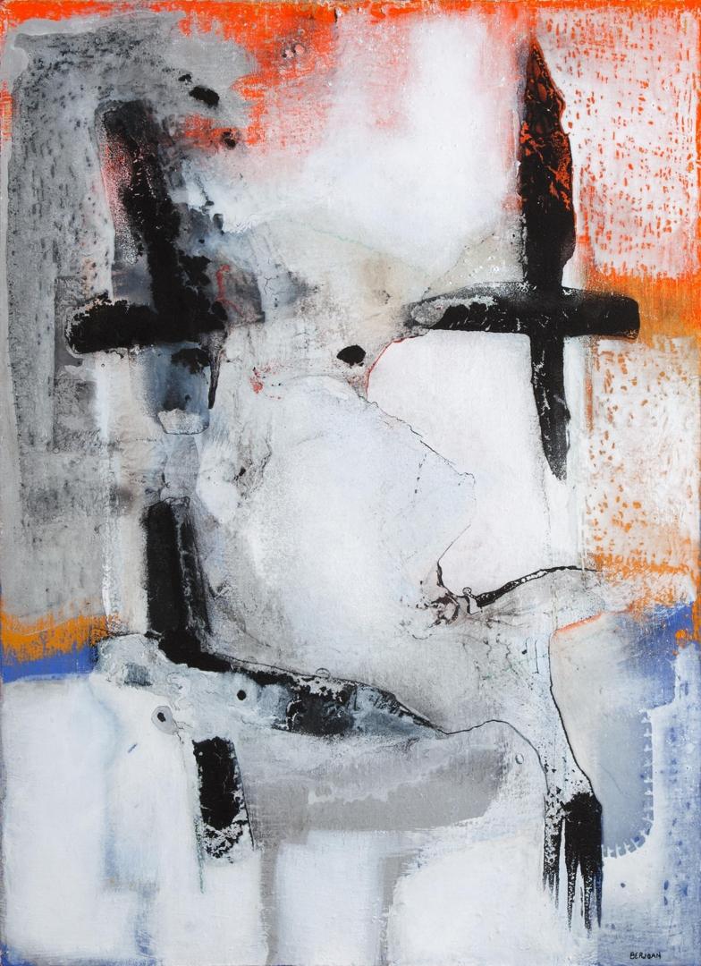On est tout d’abord intéressé par le rythme qui les anime puis le regard se familiarise avec les images insolites évoquées dans l’ampleur d’une touche gestuelle architecturant l’espace et la couleur ou le noir jaillissent. C’est l’impressionnant « Commencement », une masse noire allégée par quelques traces d’orangé, de gris, une composition presque tactile.