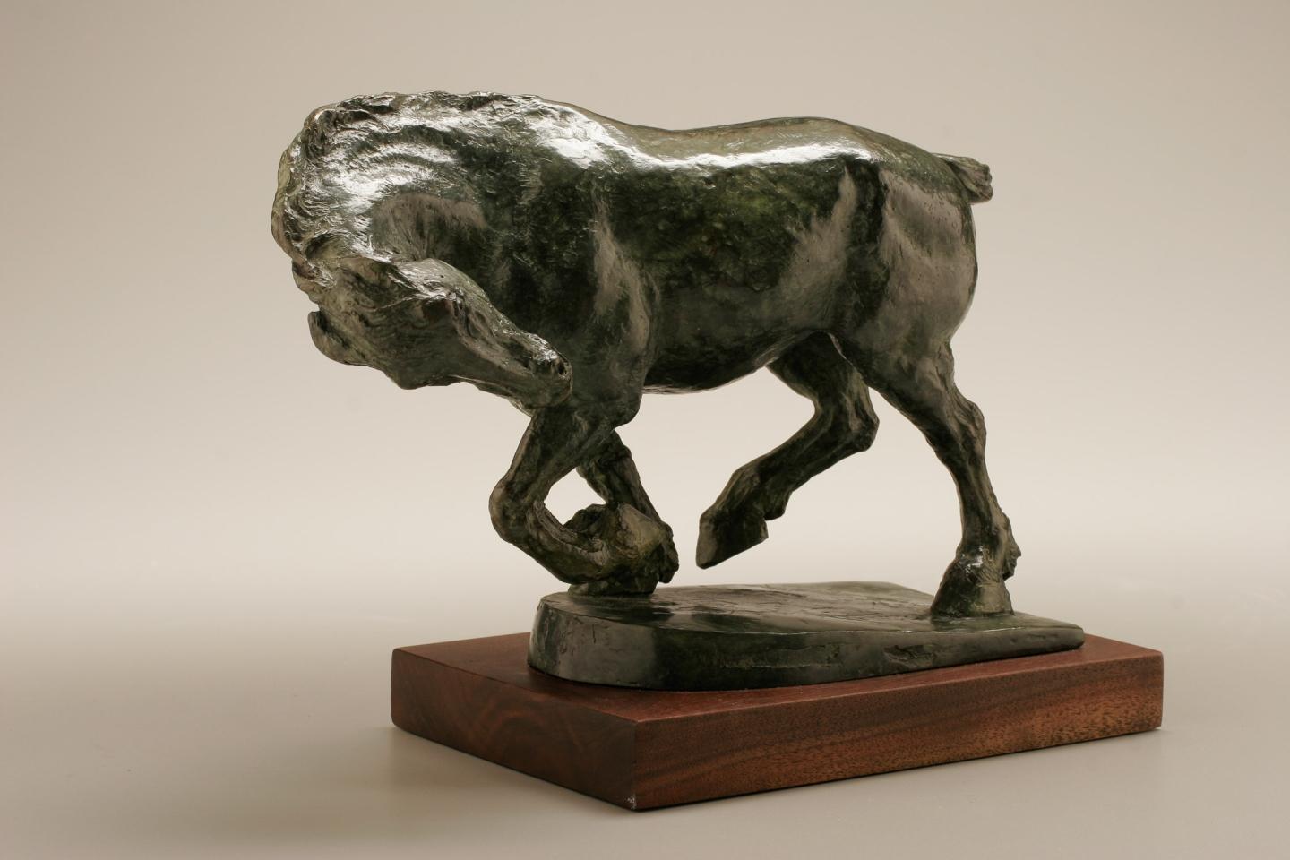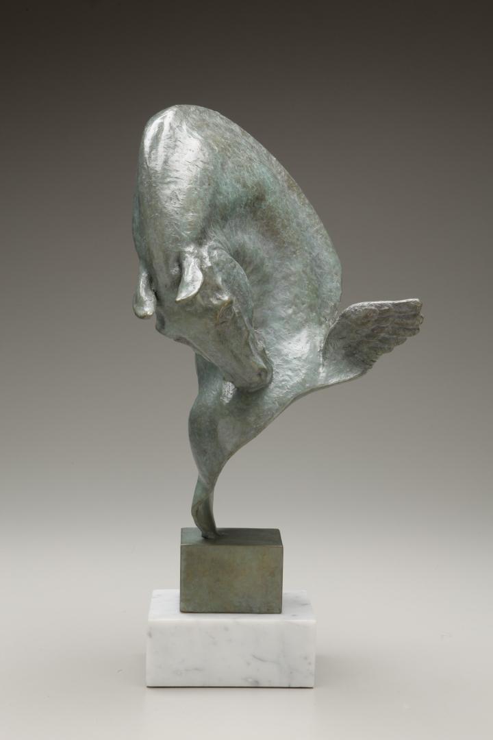 Autre thème abordé par l’artiste : le monde animalier ; elle l’évoque souvent en mouvement, parfois facétieux ainsi un couple de lapins et toujours dans l’harmonie des volumes parfois sous-tendus de tension. Ainsi lorsqu’elle sculpte des chevaux fougueux auxquels elle communique par son travail patient, une vérité charnelle sans sacrifier au détail qui peut alourdir et elle privilégie la forme.