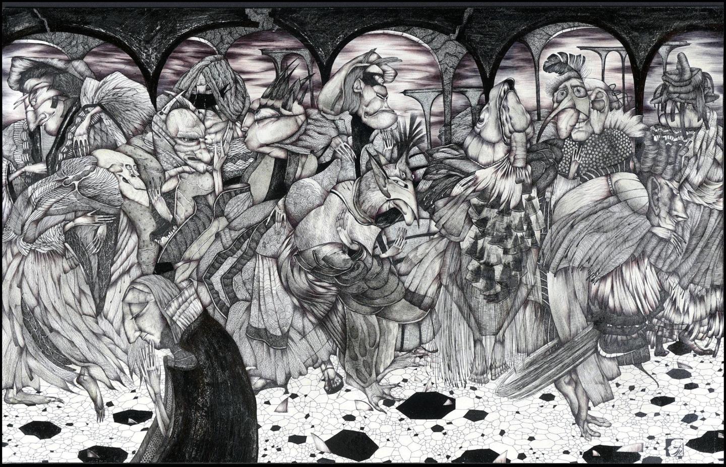 Nina Tescar qui a effectué ses études à l’Institut des Beaux-Arts de Chisinau en Moldavie (son pays d’origine) s’exprime en technique mixte dans laquelle traits et couleurs souvent vives, s’unissent pour créer une atmosphère singulière dans un espace presque saturé et dans l’élégance de la ligne. Il arrive que de ce dessin ardent, multiple surgissent des parties de corps humain : mains aux ongles fort longs, pieds ou bien des pattes d’animaux. L’homme, ses pulsions et la nature sont ici volontairement mêlés. Une impression étrange de beauté et de secret émane de cette œuvre.