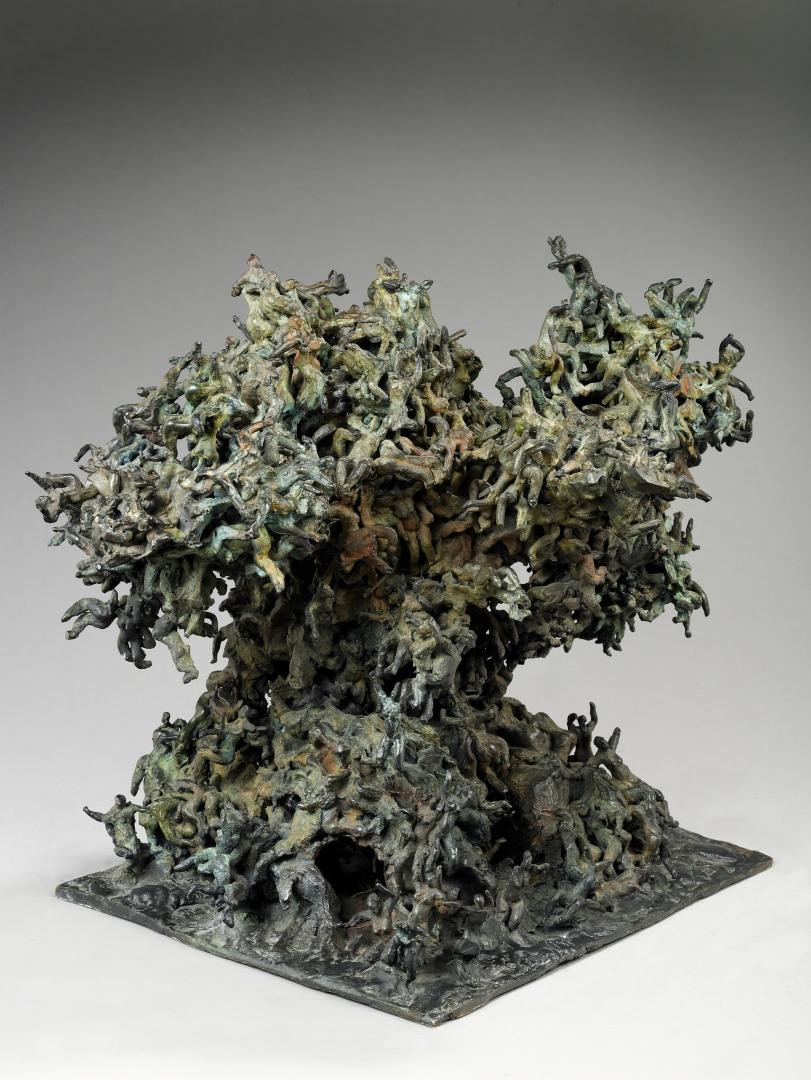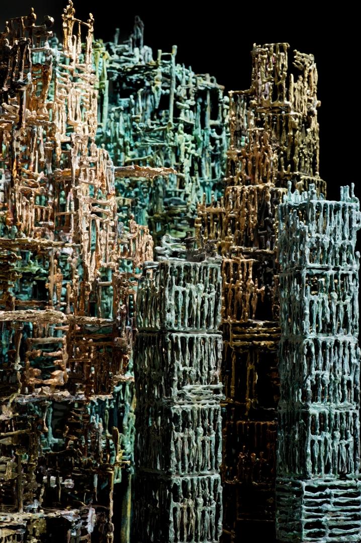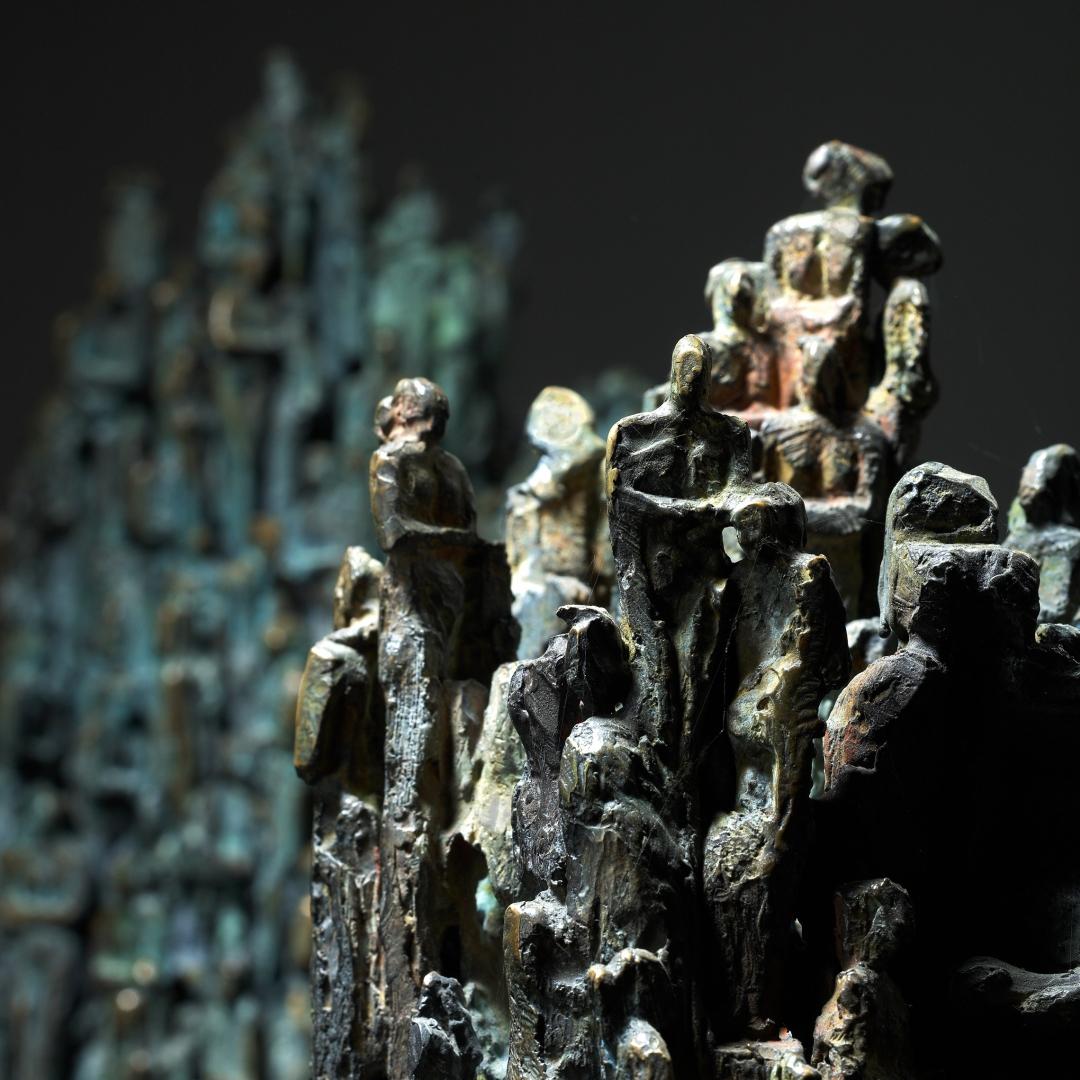 Cette sculpture entraîne dans un monde singulier peuplé d’une foule de personnages minuscules qui structurent l’œuvre ; elle nécessite une attention approfondie pour en découvrir le sens, les détails.