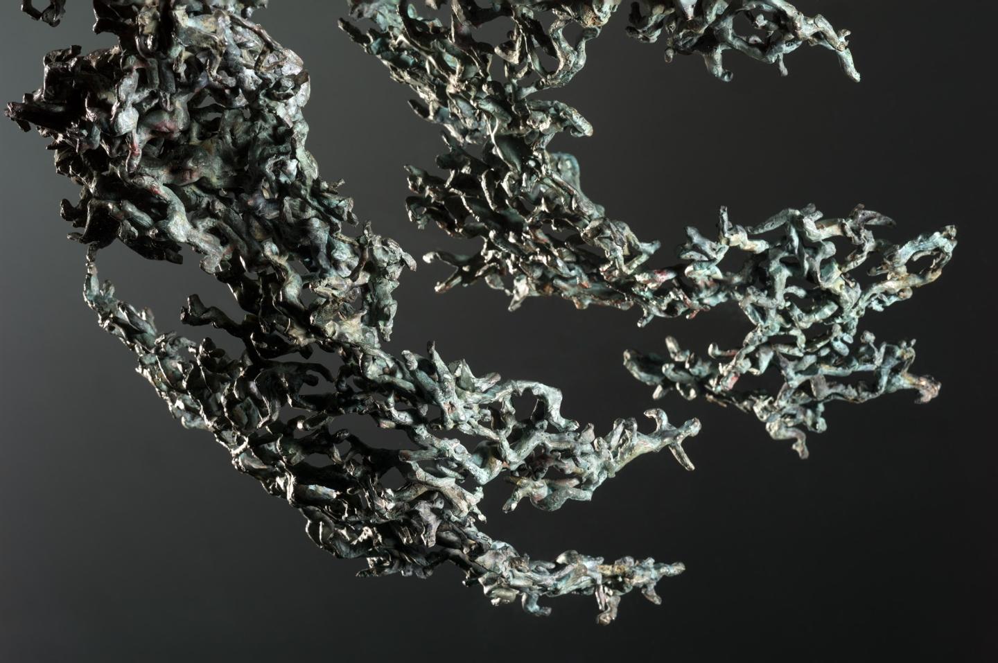 Travaillés tout en finesse ces bronzes provoquent une sensation étrange, un désir de partager la démarche du sculpteur. Nisa Chevènement campe des groupes humains insérés dans la nature avec laquelle ils se fondent, en sont partie intégrante ; c’est ainsi un arbre dont les feuilles deviennent des corps en mouvement ou des tours constituées en partie par cette multitude d’êtres vivants agglutinés les-uns aux autres et au corps étiré. Un travail exigeant qui incarne autant la foule que l’isolement. L’homme est issu de la terre et il y retournera ; l’artiste nous donne à méditer cette vérité dans la beauté d’une création originale qui pourrait paraître insolite, ce serait en ignorer la profondeur.