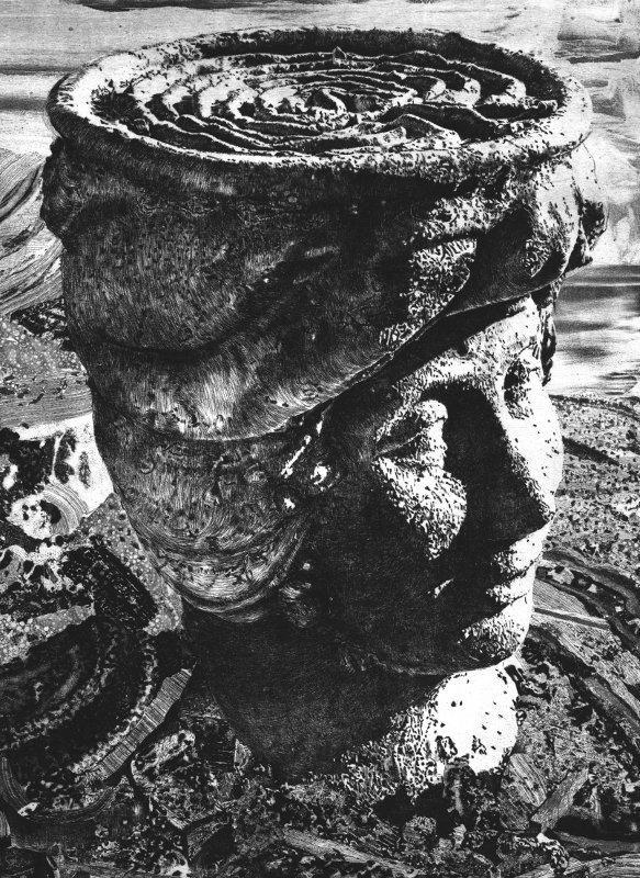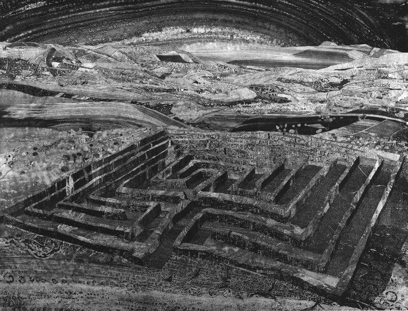 Avec cette œuvre l’antiquité redevient présente. L’artiste mène la pointe sur le vernis avec précision et virtuosité pour évoquer d’amples étendues pierreuses dans lesquelles le labyrinthe est l’élément central. Par les ressources du trait multiple, des ombres de l’aquatinte et de la lumière du blanc, il recrée ces lieux mythiques avec de belles modulations d’ombre et de lumière.