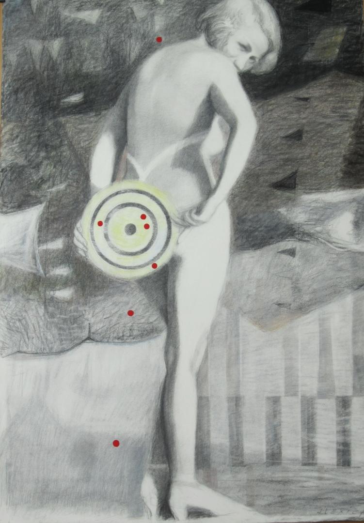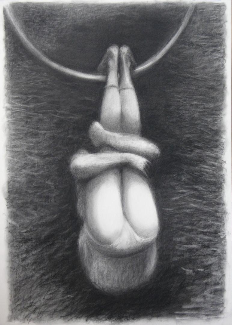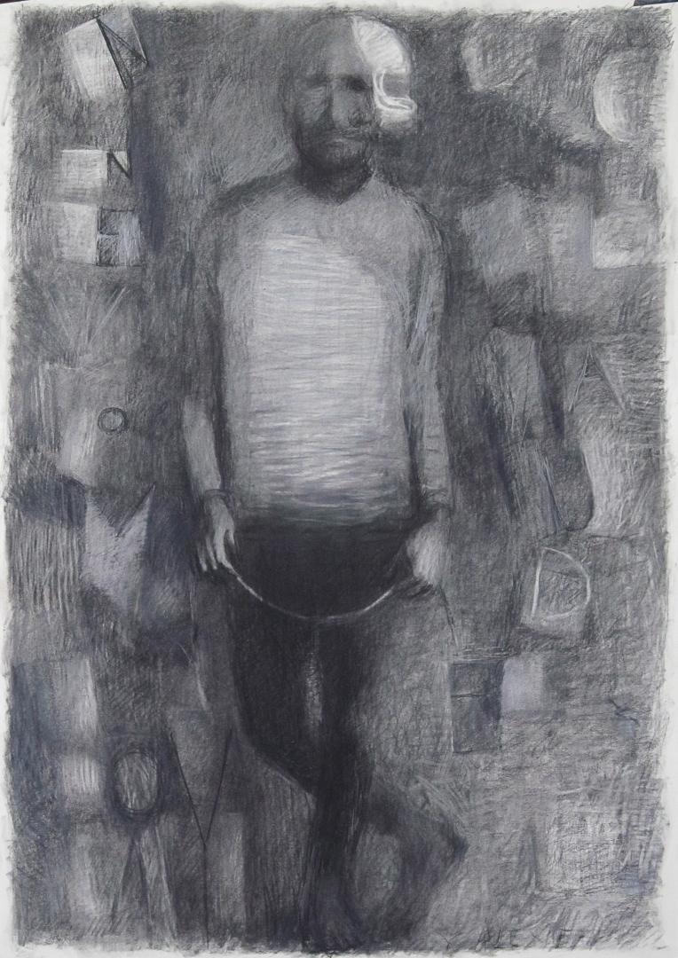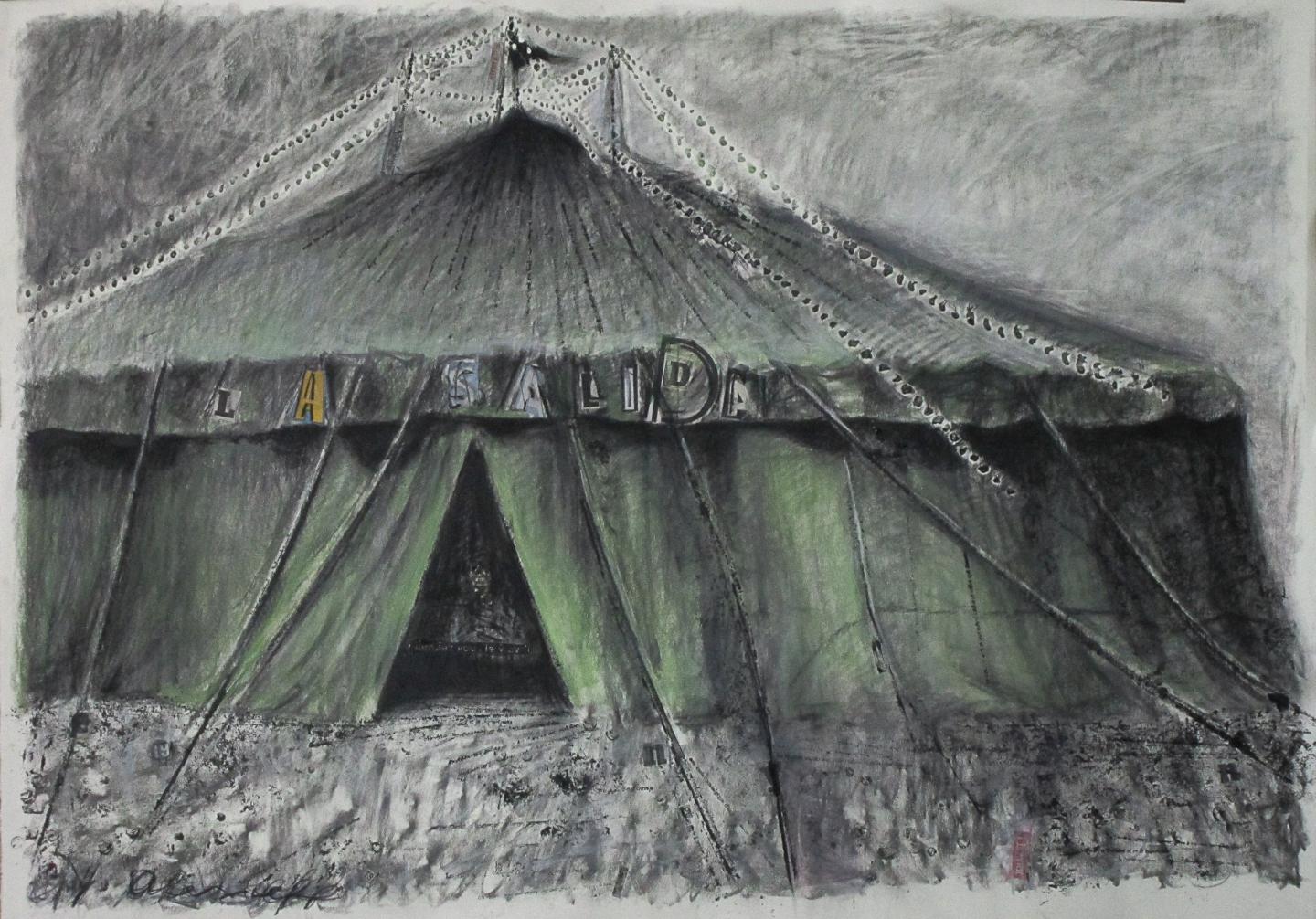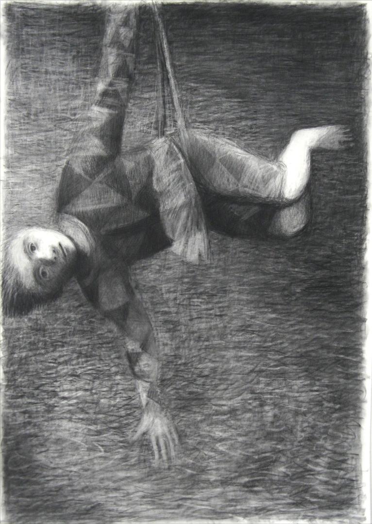 Forte est la présence des personnages qu’avec sa science du dessin Yvonne Alexieff saisit dans l’instant. Sous la lumière rutile le blanc lumineux du costume de Pierrot tandis que la pénombre est éclairée de visages expressifs. Attirée par le monde du cirque, ses prouesses techniques d’équilibristes ou par la magie d’un prestidigitateur elle les évoque dans la vérité de traits divers sans détails inutiles avec une belle sûreté. La craie illumine le noir du fusain et l’artiste rehausse, par endroit, ses personnages à l’encre et avec des collages. Elle se révèle parfaitement à l’aise dans les grands formats, sait occuper l’espace dans une mise en page aérée qui projette le personnage choisi au premier plan.